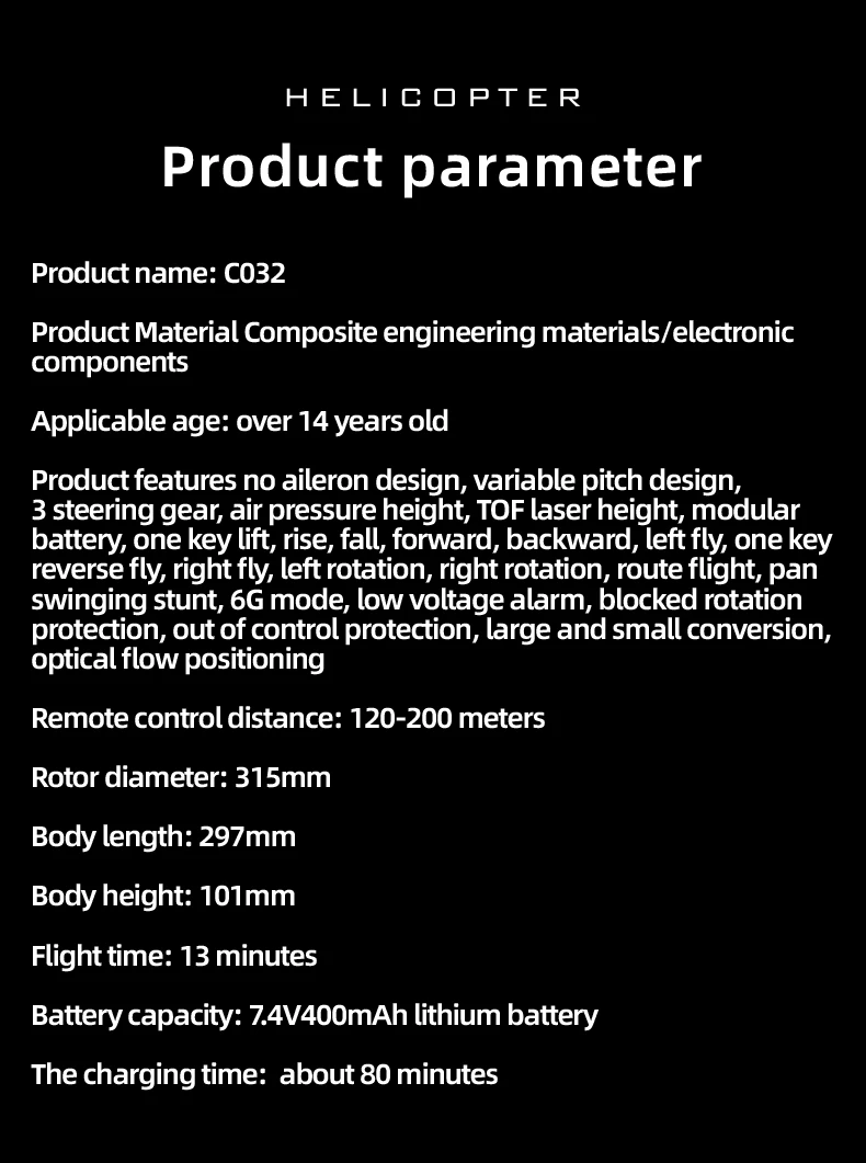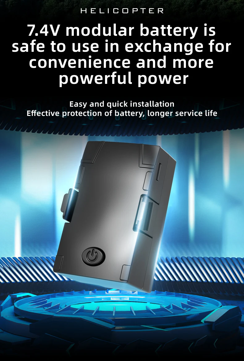 Battery details: body 7.4V, remote control 4 * 1.5AA (not included)