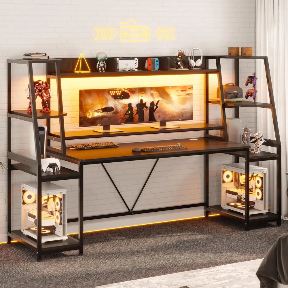 Gaming Desk 78.8'' with LED Lights, Hutch and Storage Shelves, Computer Desk with Monitor Stand, Large PC Gamer Desk Workstatio